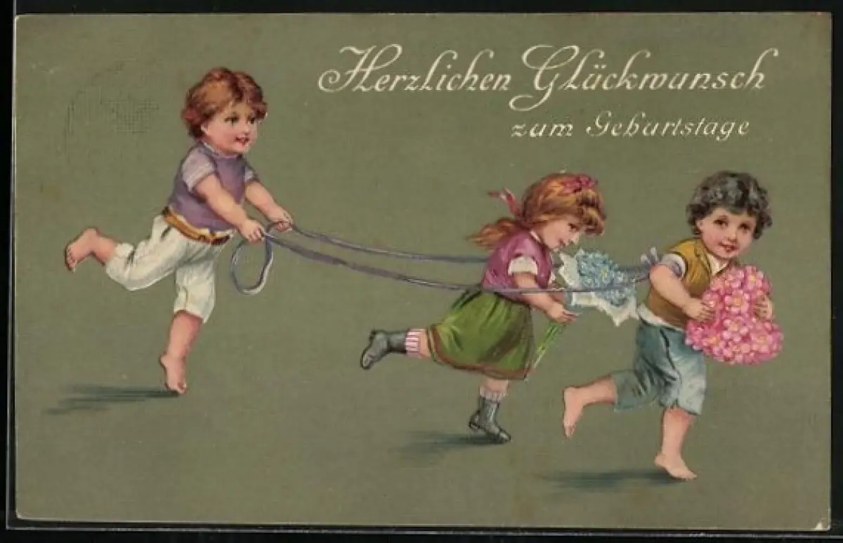 Präge-AK Drei Kinder mit Blumen, Herzlichen Glückwunsch zum Geburtstage