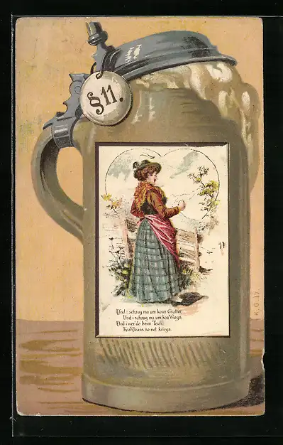 Präge-AK Frau in Tracht in einem Bierkrug, Brauerei, Passepartout