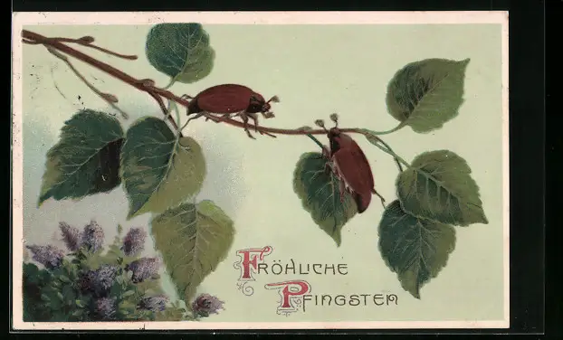 Präge-AK Fröhliche Pfingsten, Maikäfer auf einem Zweig