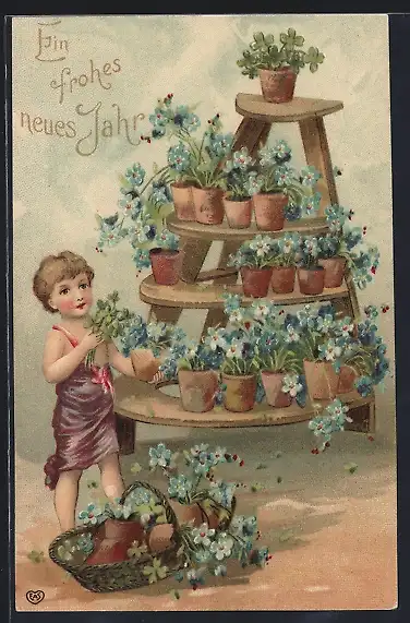 Präge-AK Gärtnerin am Regal mit Blumentöpfen, Neujahrsgruss