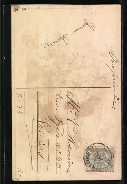Personenbezogene Daten auf der Rückseite der Karte wurden durch blauen Textmarker unkenntlich gemacht. Die blauen Stellen sind auf die Vorderseite durchgeweicht und wirken sich negativ auf das Postkartenfoto aus