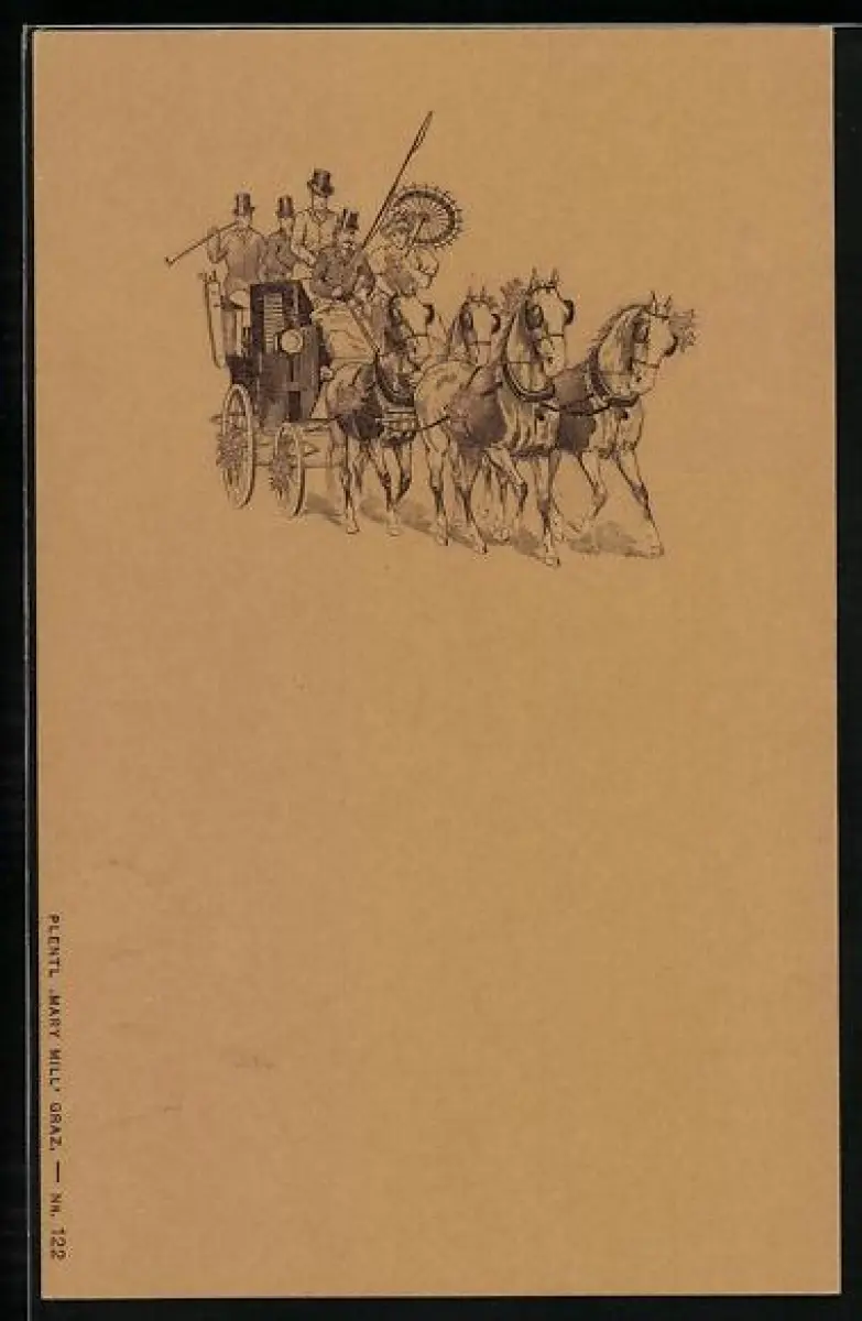 Präge-AK Gesellschaft mit Schirm in einer Pferdekutsche