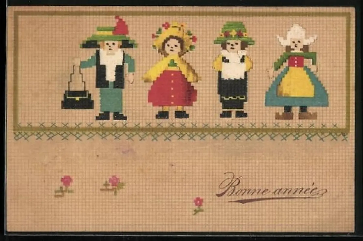 Präge-AK Gestickte Figuren mit Neujahrsgruss
