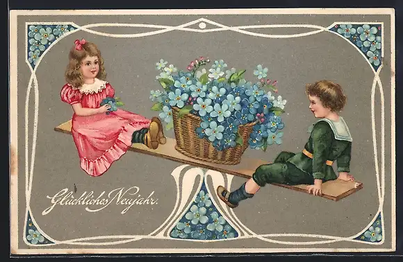 Präge-AK Glückliches Neujahr, Kinder und Vergissmeinnicht auf einer Wippe