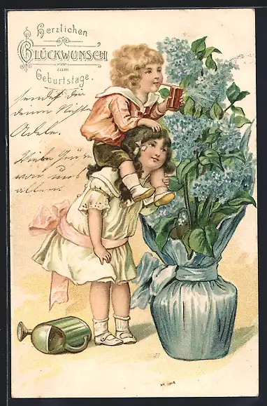 Präge-AK Glückwunsch zum Geburtstage, Kleiner Junge auf Schulter seiner Schwester giesst grossen Blumentopf