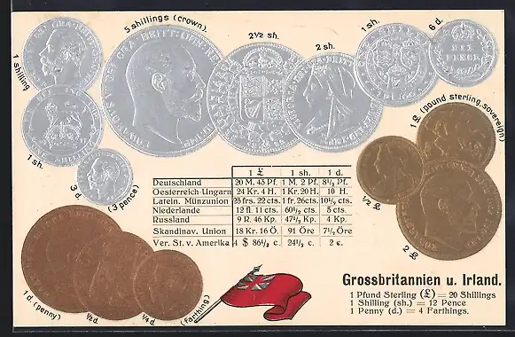 Präge-AK Grossbritannien u. Irland, Münzen und Flagge, Umrechnungstabelle
