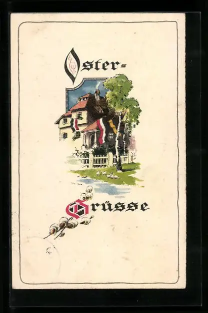Präge-AK Haus mit Fahnen und Baum, Kätzchenzweig, Osterguss