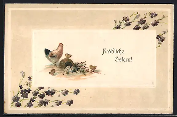 Präge-AK Henne mit Osterküken und Zweigen, Ostergruss