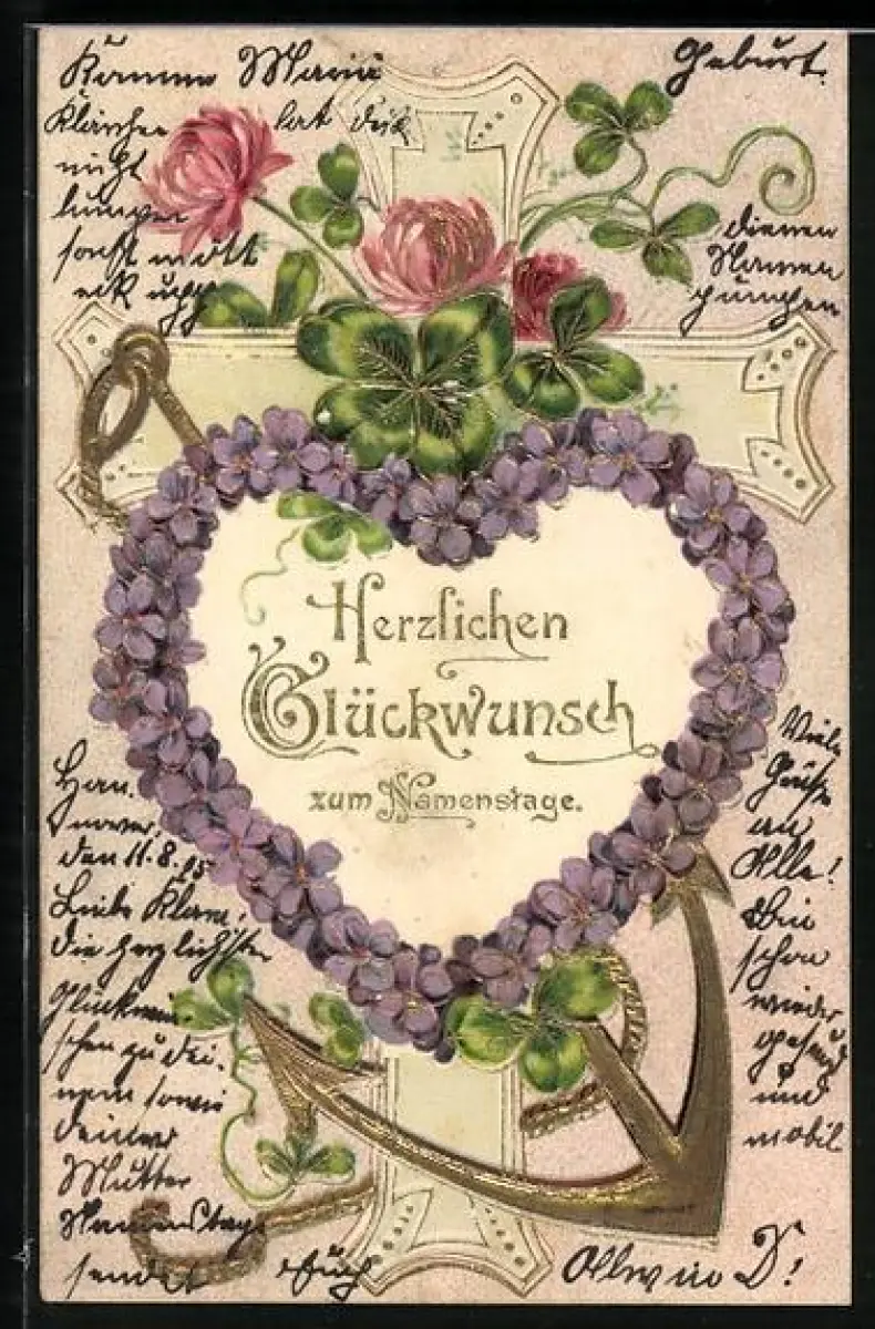 Präge-AK Herz aus Vergissmeinnicht und Anker, Glückwunsch zum Namenstag