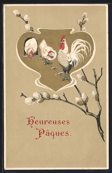 Präge-AK Heureuses Pâques, Hühner auf einer Leiter