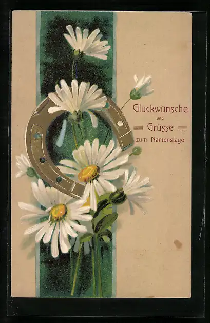 Präge-AK Hufeisen und Margarithenblumen zum Namenstag