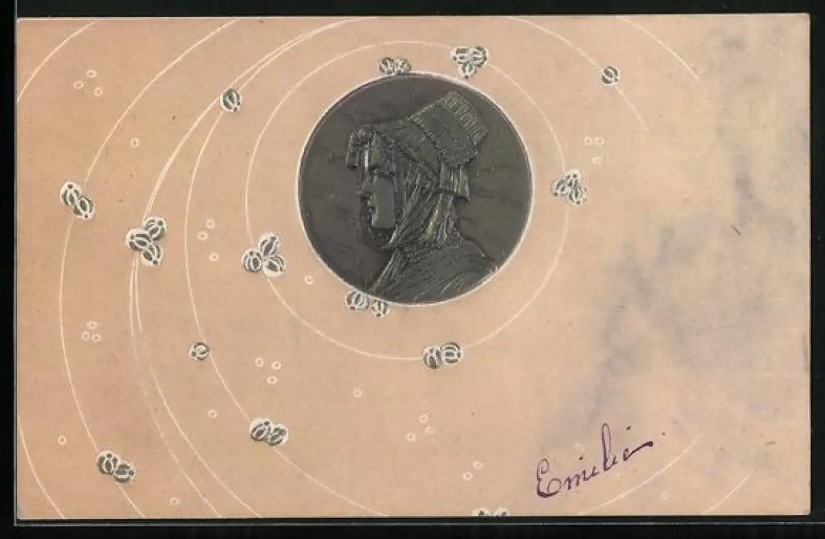 Präge-AK Junge Frau mit hohem Hut im Profil, Jugendstil
