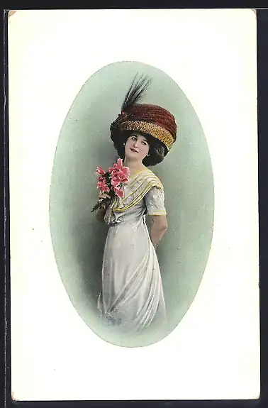 Präge-AK Junge elegante Frau mit Hut und Blumen