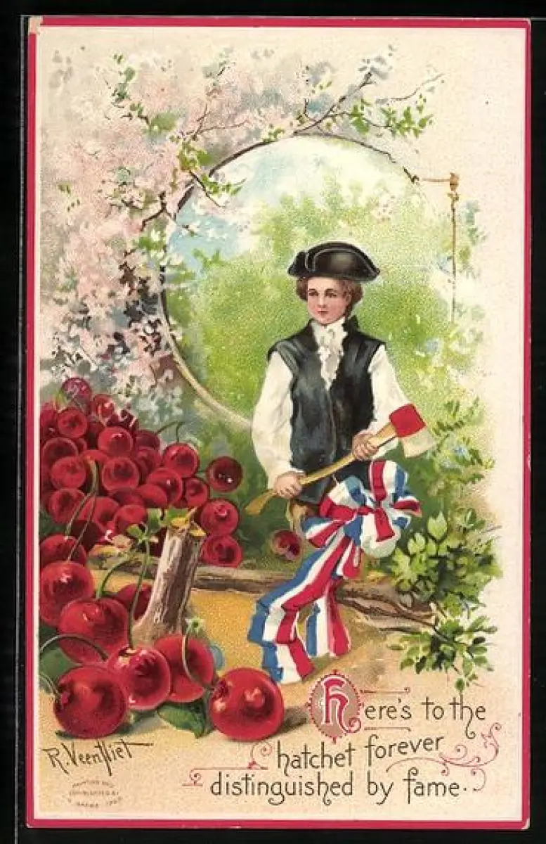 Präge-AK Junge mit Axt bei der Ernte riesiger Kirschen
