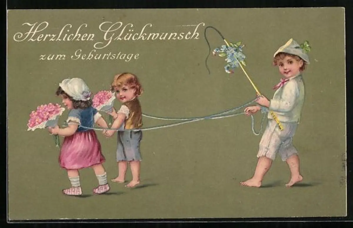 Präge-AK Junge mit einem Gespann aus zwei kleinen Kindern mit Blumensträussen