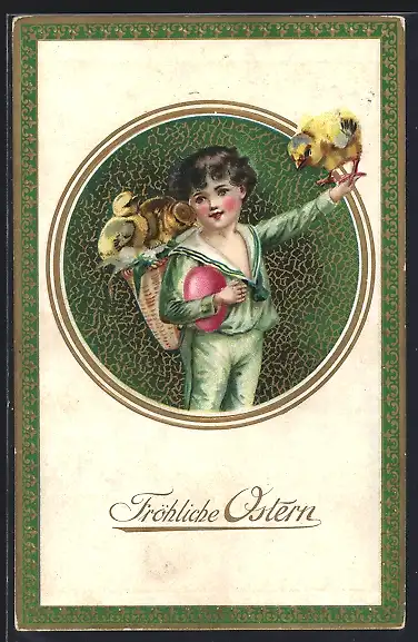 Präge-AK Junge trägt Osterküken in einem Korb