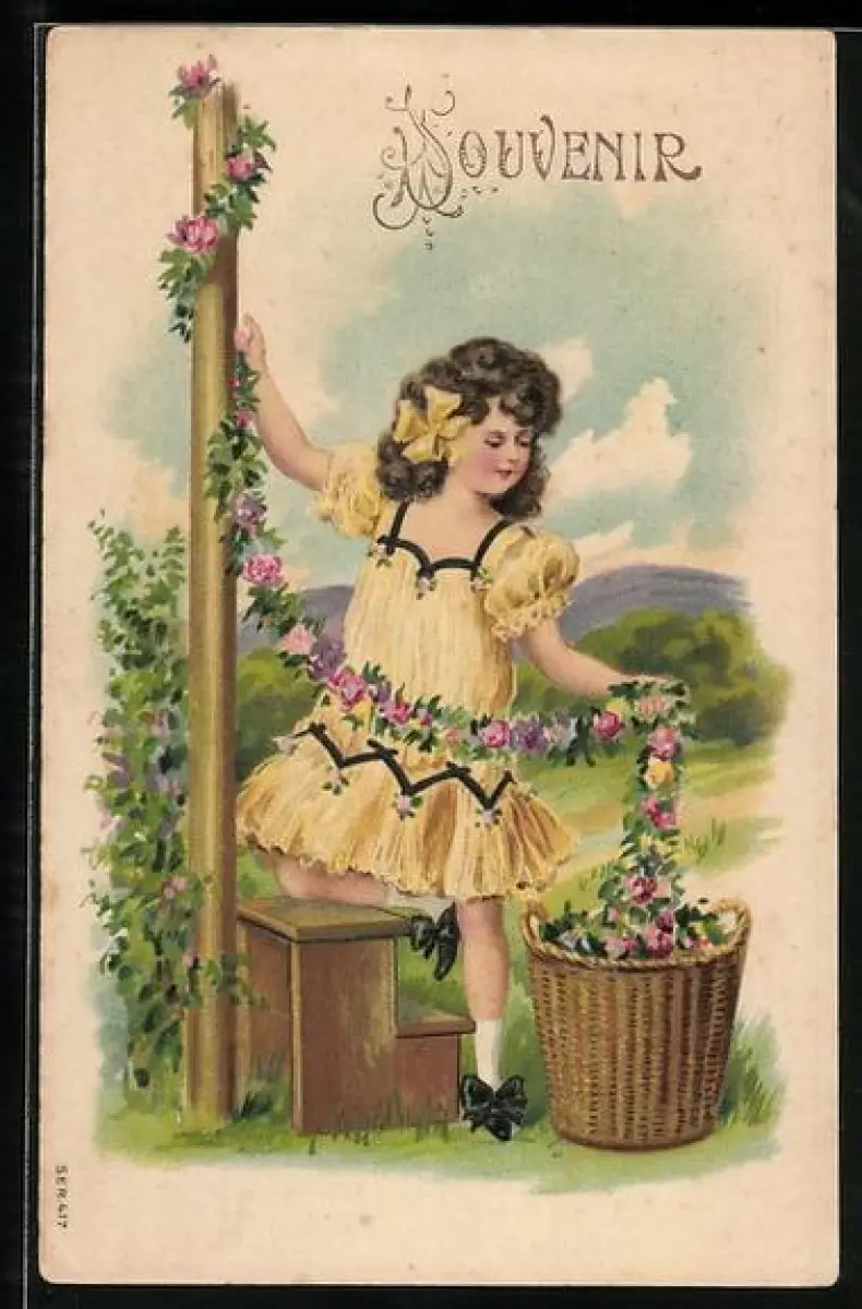 Präge-AK Junges Mädchen hängt eine Girlande aus Rosen auf