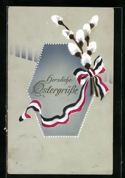 Präge-AK Kätzchenzweig mit Fahnenband, Ostergruss