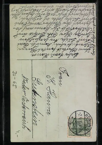 Personenbezogene Daten auf der Rückseite der Karte wurden durch blauen Textmarker unkenntlich gemacht. Die blauen Stellen sind auf die Vorderseite durchgeweicht und wirken sich negativ auf das Postkartenfoto aus