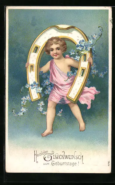 Präge-AK Kind mit Hufeisen und Vergissmeinnicht, Glückwunsch zum Geburtstag