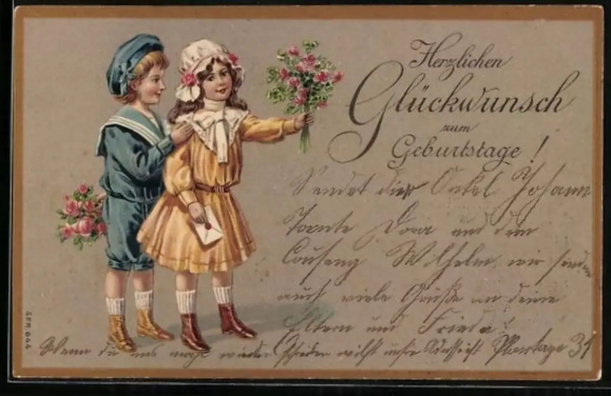 Präge-AK Kinder bringen Blumensträusse und einen Brief zum Geburtstag