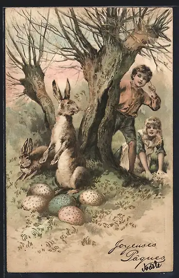 Präge-AK Kinder entdecken Osterhasen hinter einer Weide