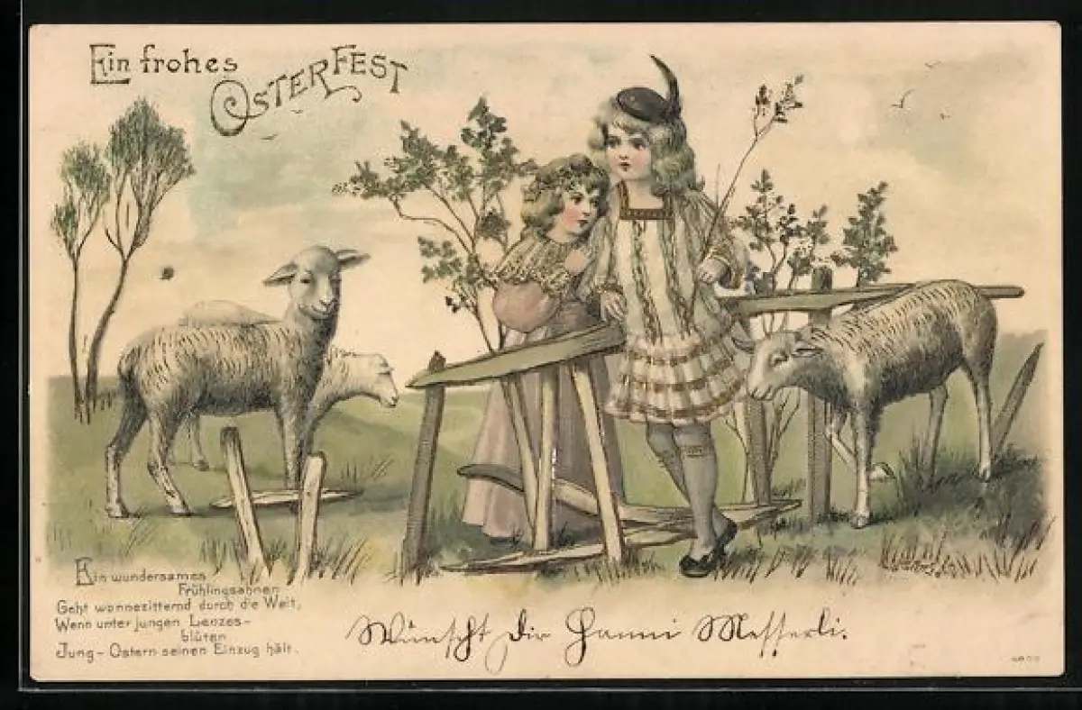 Präge-AK Kinder mit Lämmchen auf einer Wiese, Ein frohes Osterfest