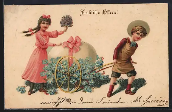 Präge-AK Kinder ziehen einen Karren mit Osterei und Vergissmeinnicht