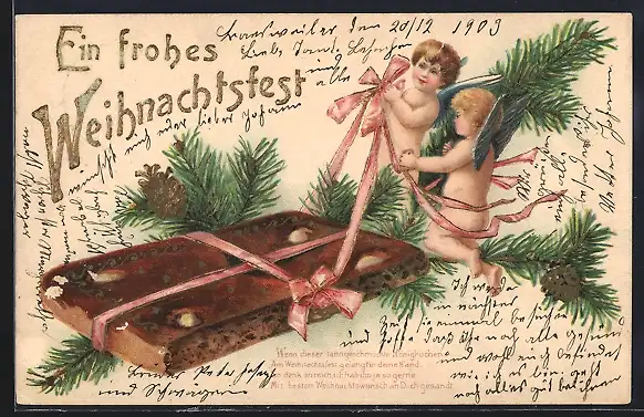 Präge-AK Kleine Engelchen mit einem Lebkuchen, Weihnachtsgruss
