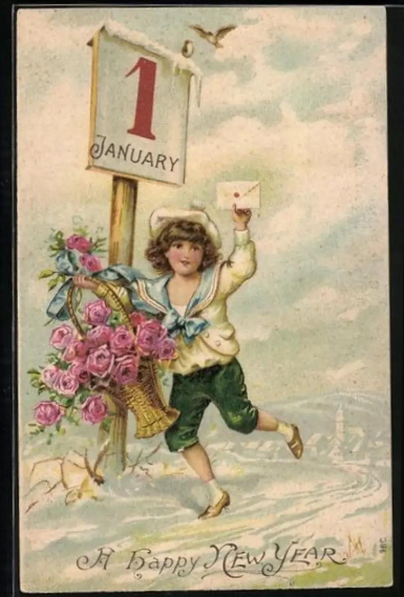 Präge-AK Kleiner Matrose bringt Blumen und Brief, Kalenderblatt 1 January, A Happy New Year