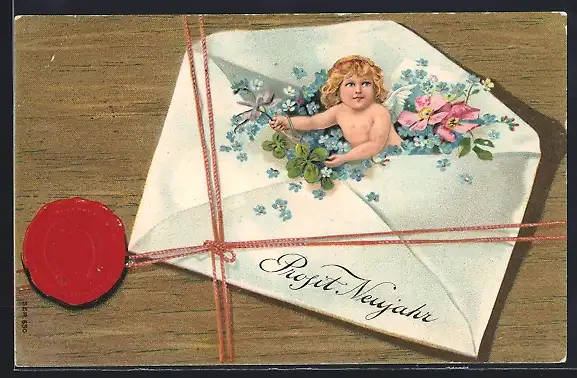 Präge-AK Kleiner Neujahrsengel, Kleeblatt und Vergissmeinnicht in einem Briefumschlag