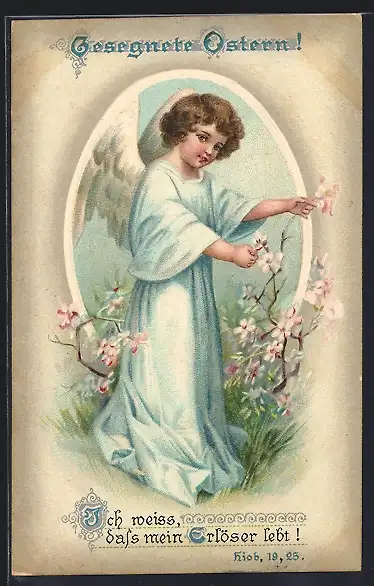 Präge-AK Kleiner Osterengel mit Frühlingsblüten