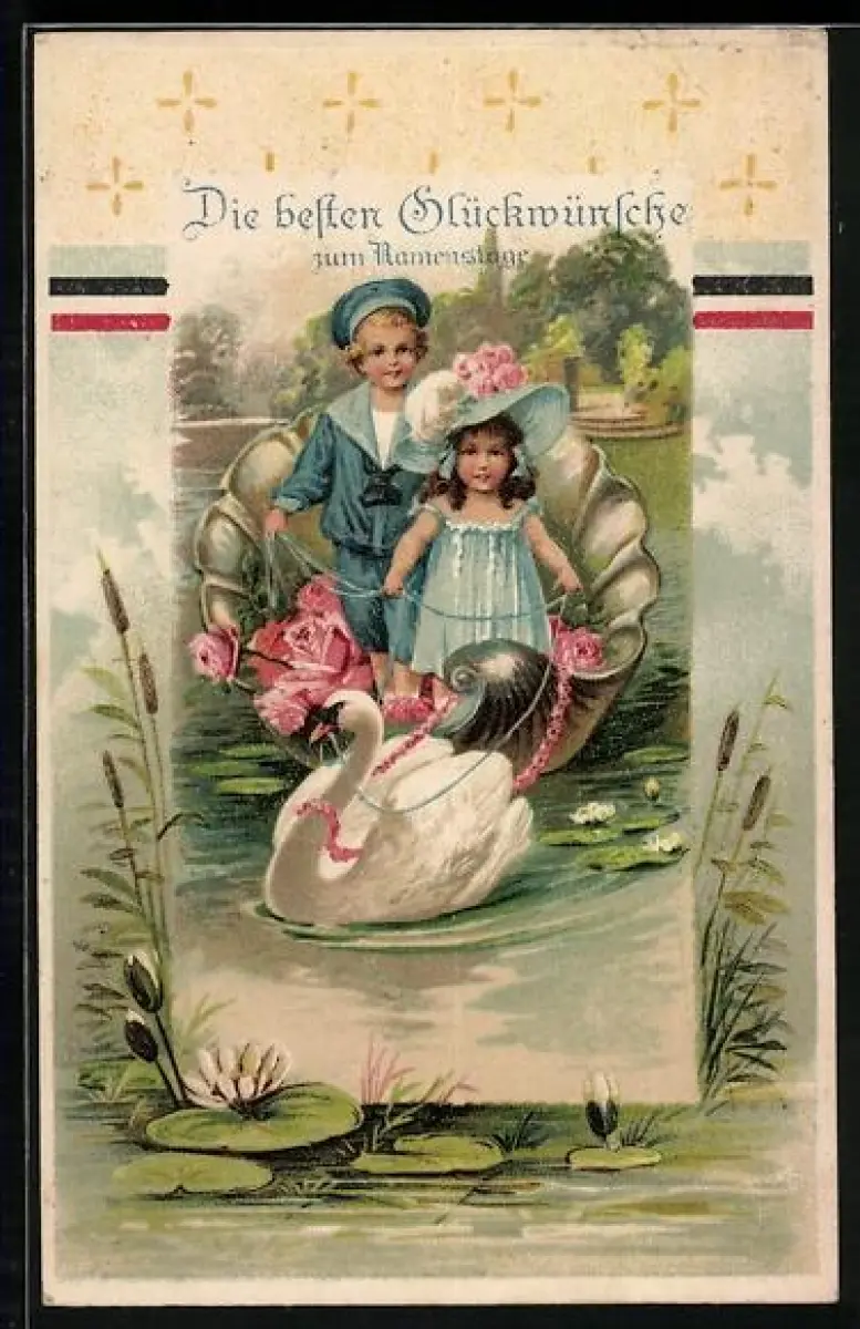 Präge-AK Kleines Paar in Boot mit Schwan, Glückwünsche zum Namenstag