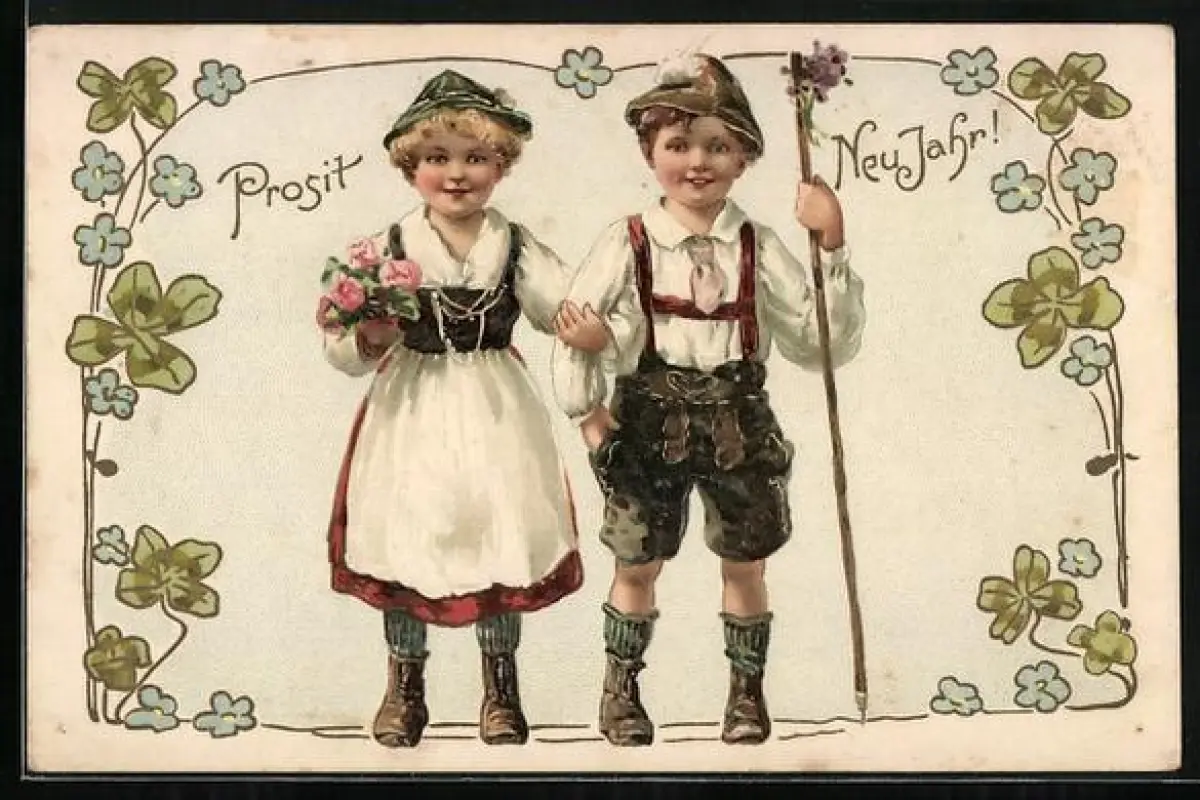 Präge-AK Kleines Paar in Trachten im Kleeblatt-Rahmen, Prosit Neujahr