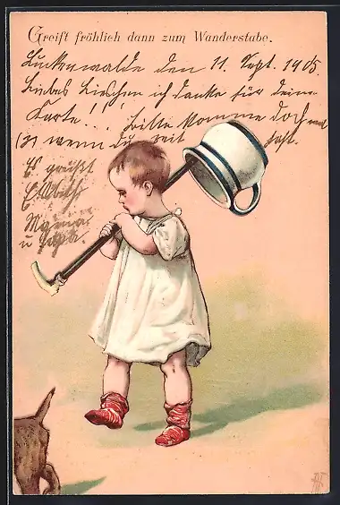 Präge-AK Kleinkind mit Nachttopf und Wanderstock