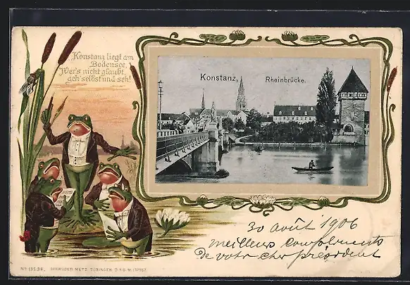 Präge-AK Konstanz, Blick entlang der Rheinbrücke