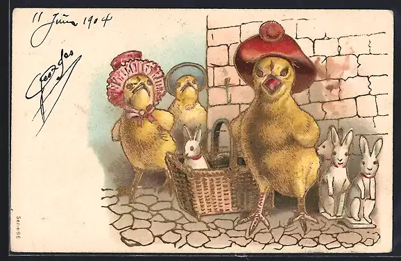 Präge-AK Küken in Hüten mit kleinen Osterhasen-Figuren