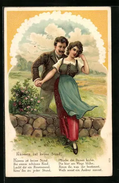 Präge-AK Küssen ist keine Sünd', Liebespaar an einer Mauer stehend
