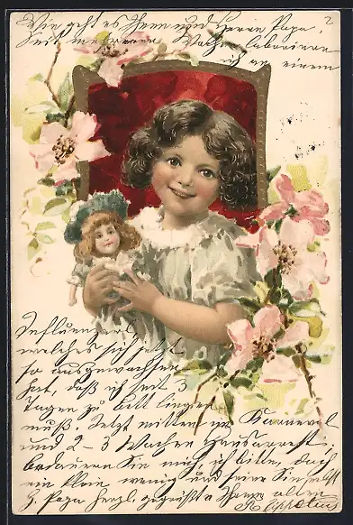 Präge-AK Lächelndes Mädchen mit Puppe, Blumen