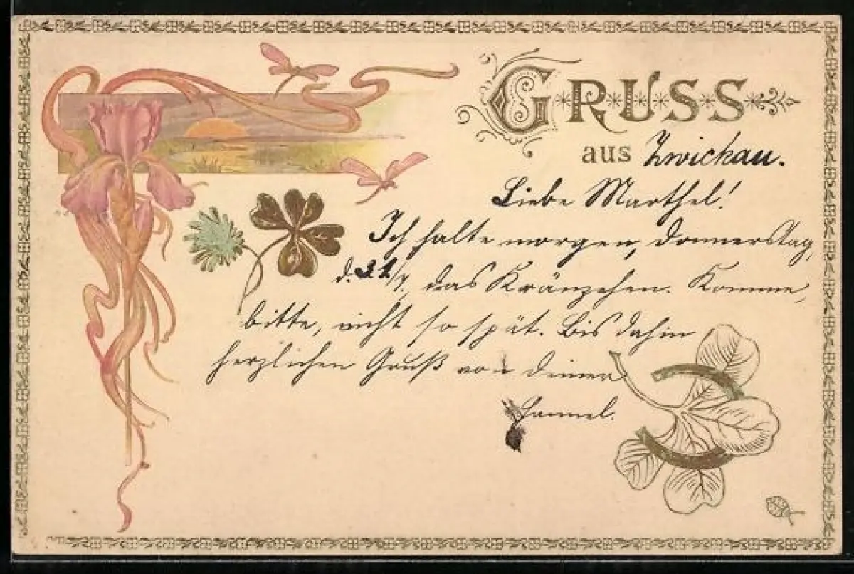 Präge-AK Landschaftsidyll bei Sonnenuntergang mit Klee und Hufeisen, Jugendstil
