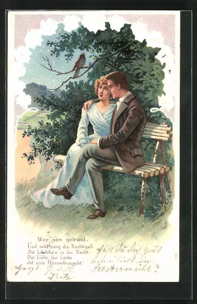 Präge-AK Liebespaar bei nächtlichem Spaziergang auf einer Bank