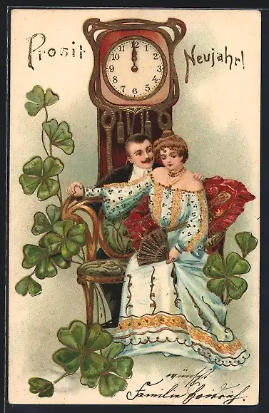 Präge-AK Liebespaar sitzt an einer Standuhr, Prosit Neujahr, Kleeblätter