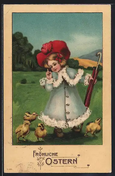 Präge-AK Mädchen im Mantel mit Osterküken zu ihren Füssen