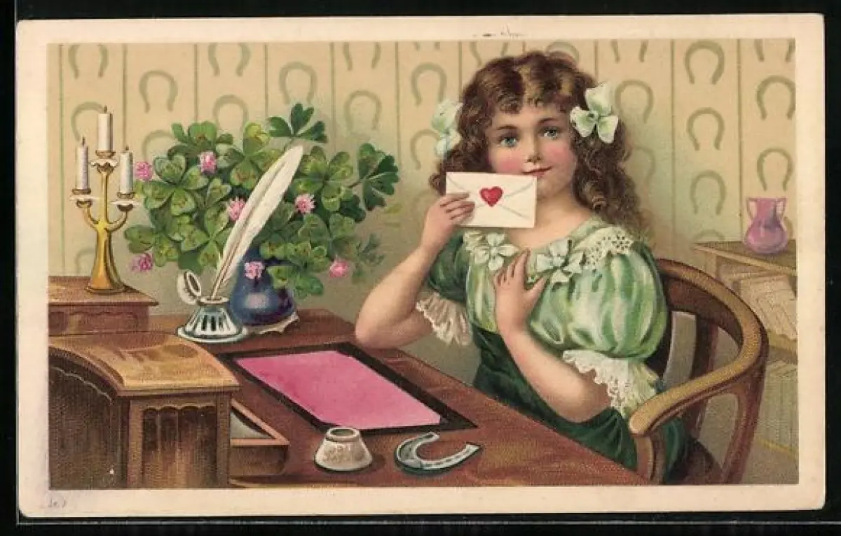 Präge-AK Mädchen im grünen Kleid sitzt am Schreibtisch und versiegelt einen Brief mit einem Herzen