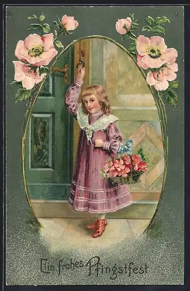 Präge-AK Mädchen mit Blumenkorb läutet an der Tür, Pfingstgruss