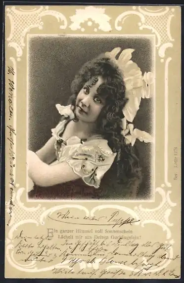 Präge-AK Mädchen mit Haube, Ornament-Rahmen, Jugendstil