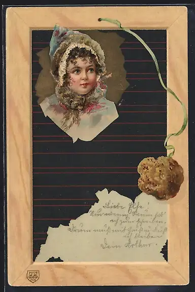 Präge-AK Mädchen mit Pelz auf einer Schiefertafel