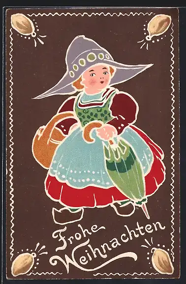 Präge-AK Mädchen mit Regenschirm und Korb im weiten Kleid auf einem Lebkuchen