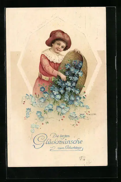 Präge-AK Mädchen mit Vergissmeinnicht zum Geburtstag