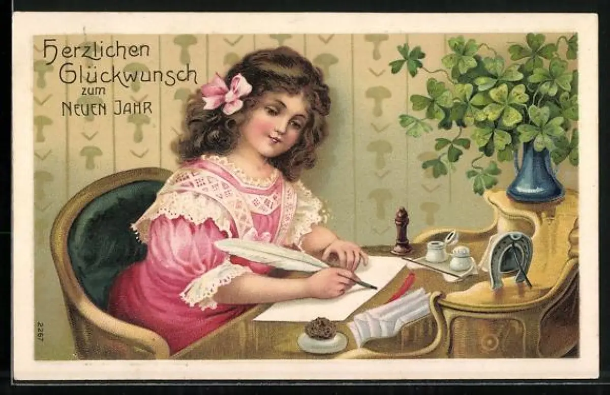 Präge-AK Mädchen schreibt nebst Kleeblatt-Strauss einen Brief am Sekretär, Neujahr